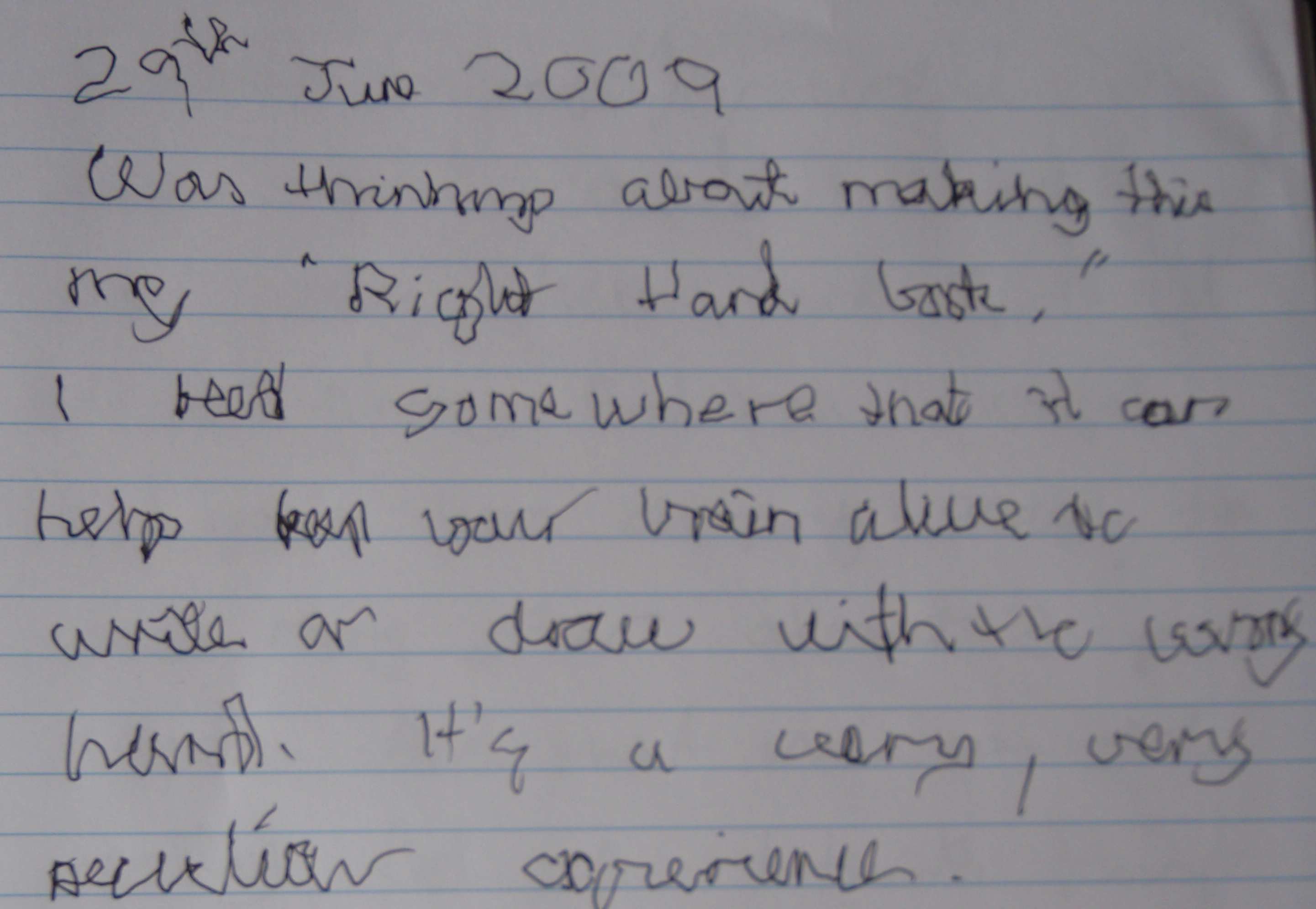 - Exploring all the possibilities of writing with my right hand, cutting loose, letting go, scribbling and shading, drawing big shapes and small shapes, tiny stick men and perfect circles, seems to improve things just as much, if not more than simply concentrating tighter and tighter control and getting the letters perfect. Periods of "going crazy" scribbling and doodling followed by focussed concentration seem to work best of all.