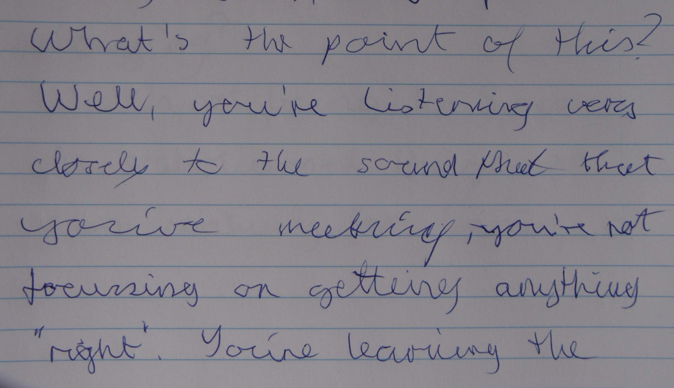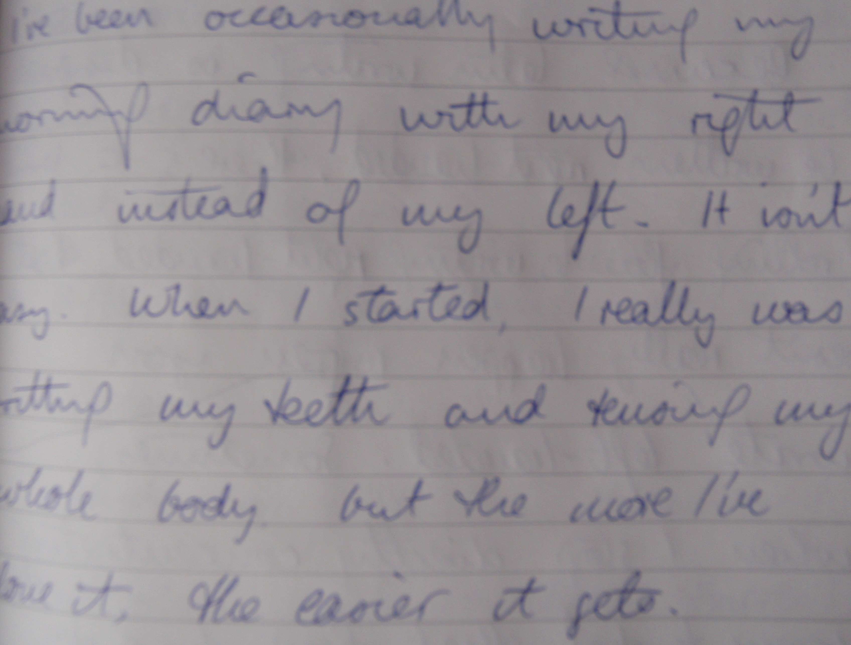 I would often find myself just heading off in the wrong direction with the pen, or "losing it" altogether and not being able to write anything at all.But of course, the more I've done it, the easier it's got. Very early on in the process it dawned on me "Hey! I already know how to write! I already know all the letters of the alphabet and how to put them in the right order. In other words, I already know all the THEORY of writing, but that doesn't mean that it's any easier to put the thing into practice."Three weeks later - better but still room for improvement