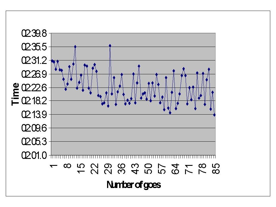 The graph is showing an overall pattern of improvement, but you can't necessarily see this from the individual scores. Even when things are getting better, and I'm getting nearer the qualifying time, there are a lot of scores that are nearly as bad as when I started.